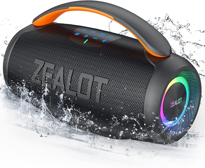 • 【IPX6 Waterproof & Portable Handle Design】Certified by IPX6, no need to worry about splashing water, rain, accidental spills or dust. With a built-in handle, the ZEALOT Extreme Boom portable speaker gives you an extra grip to carry your outdoor soundtracks anywhere